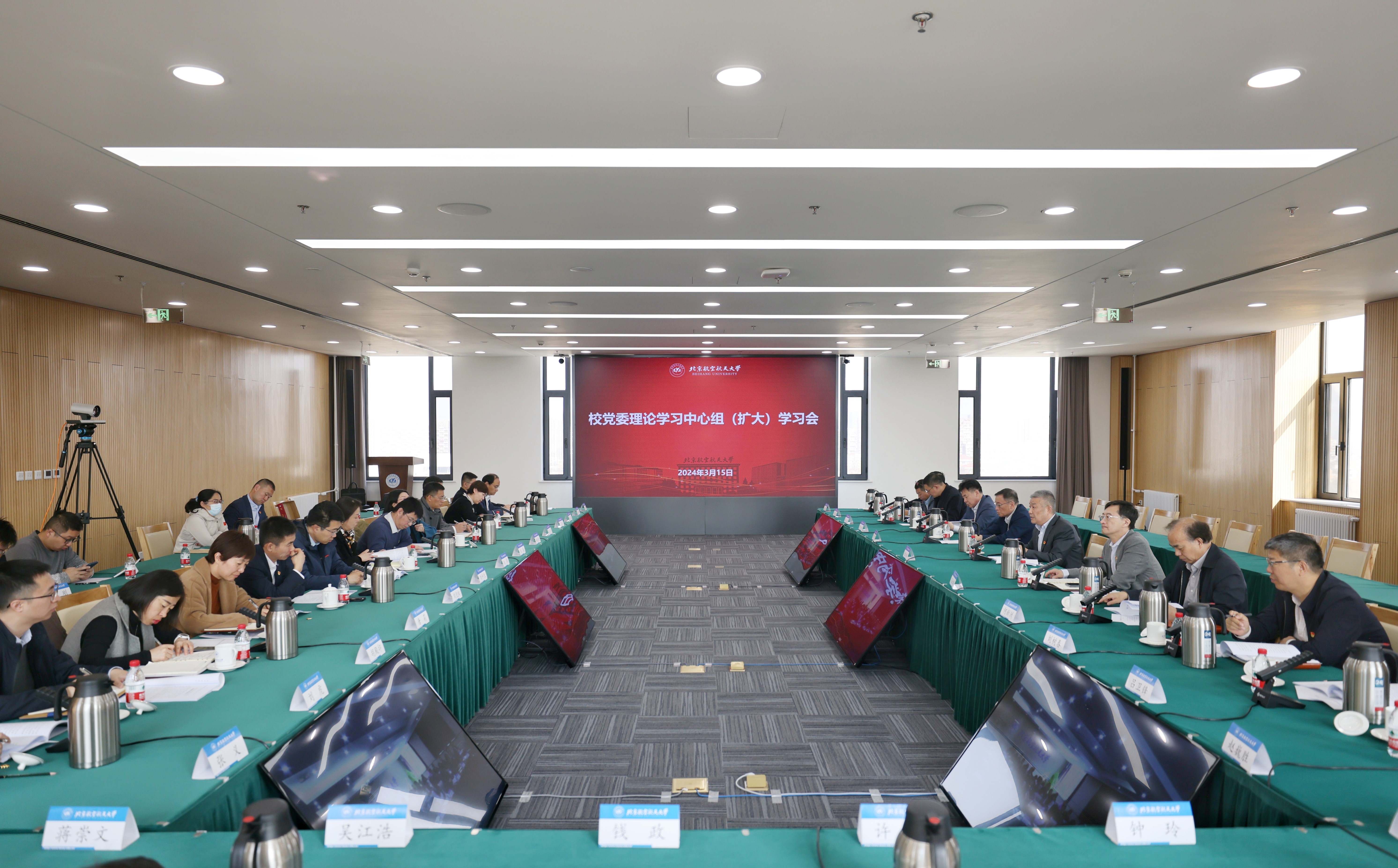 北航新闻网3月15日电 (航宣/文 宋超 邸白鹭/摄影) 3月15日上午,我校召开党委理论学习中心组(扩大)学习会,深入学习贯彻习近平总书记重要讲话精神和全国两会精神。会议在沙河校区八号楼1301会议室和学院路校区如心会议中心中报告厅同步召开。全国政协委员、校党委书记赵长禄主持会议。