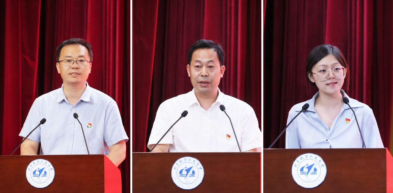 会上,“标杆学院”建设单位代表、计算机学院党委书记李建欣,教职工样板支部、“双带头人”教师党支部书记工作室建设单位代表、机械学院机器人研究所教工党支部书记王党校,学生样板支部建设单位代表、沈元学院卓越工程师学院路博士生党支部书记周岳分别作了交流发言。