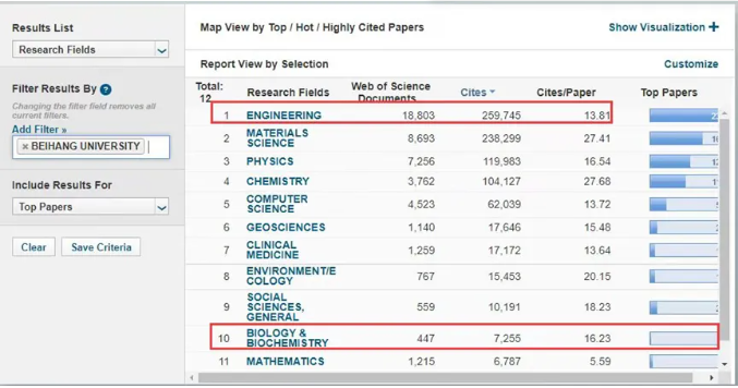 北航已有11个ESI学科,其中工程学、材料科学、计算机科学、化学4个为千分之一学科,工程学为万分之一学科