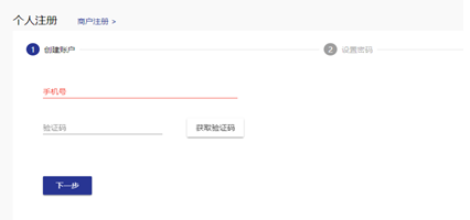 3.点击注册之后,输入手机号并点击获取验证码按钮,输入正确的验证码,进行密码设置;