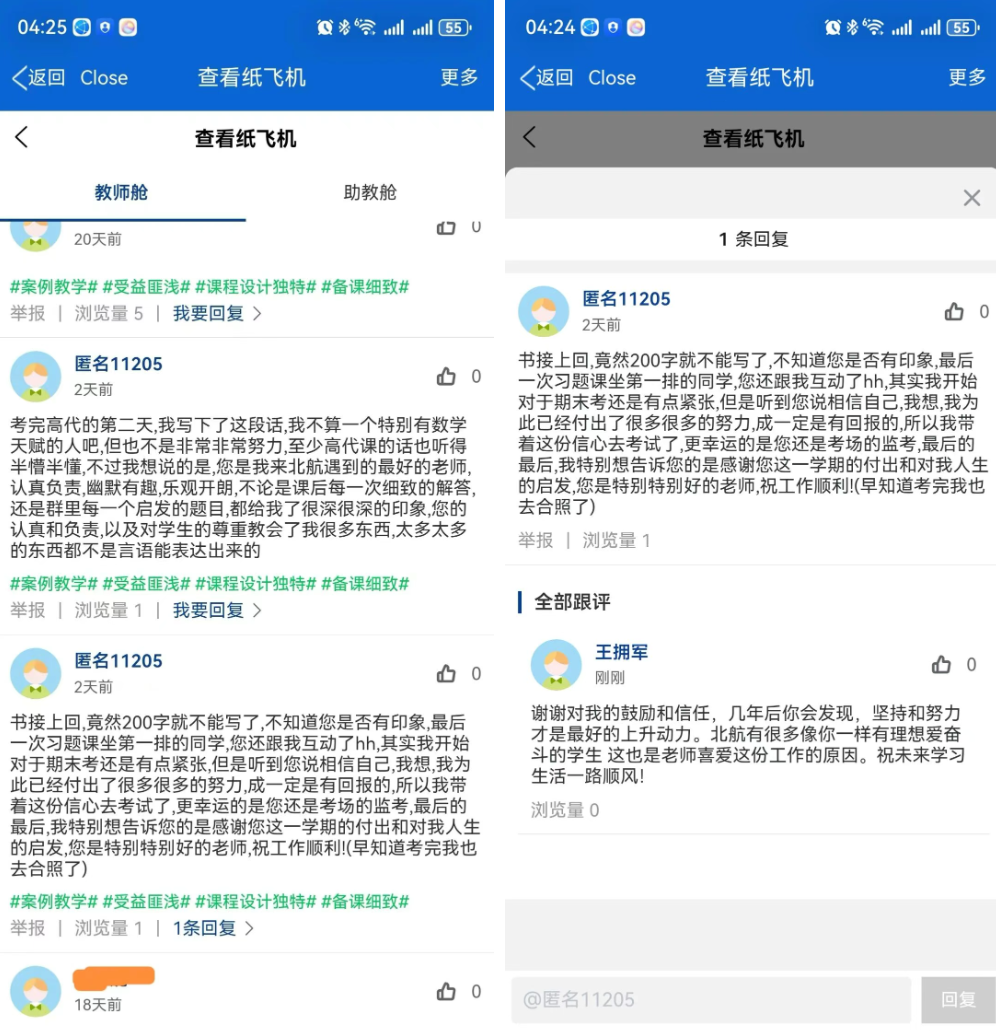 有学生在纸飞机里留言:“王老师,我不算有数学天赋的人,努力程度也算不上顶尖。但您绝对是我在北航遇到的最好的老师!您的认真负责,还有对每一位学生的尊重,让我学到了很多课本之外的东西。”