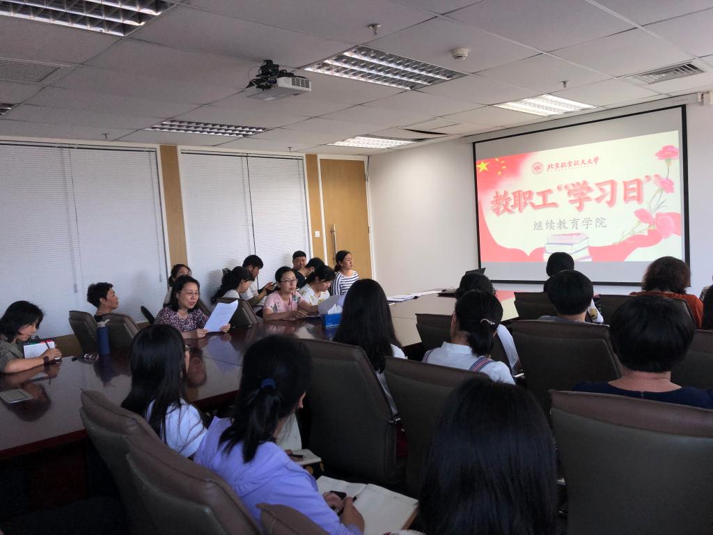 此外,分别由教培中心的胡老师、成教的李老师、远程学院的周老师、办公室的苏老师带领大家学习了习近平总书记在纪念五四运动100周年大会上的讲话精神、《庆祝新中国成立70周年我和我的祖国爱国主义主题教育方案》、《beats365亚洲版官网作风建设专项行动工作方案》及《新时代北京高校教师职业行为十项准则》。老师们围绕文件精神,结合自身工作,针对如何使工作从规范到卓越等进行了研讨,与会人员积极阐述自己的见解,充分交流讨论。