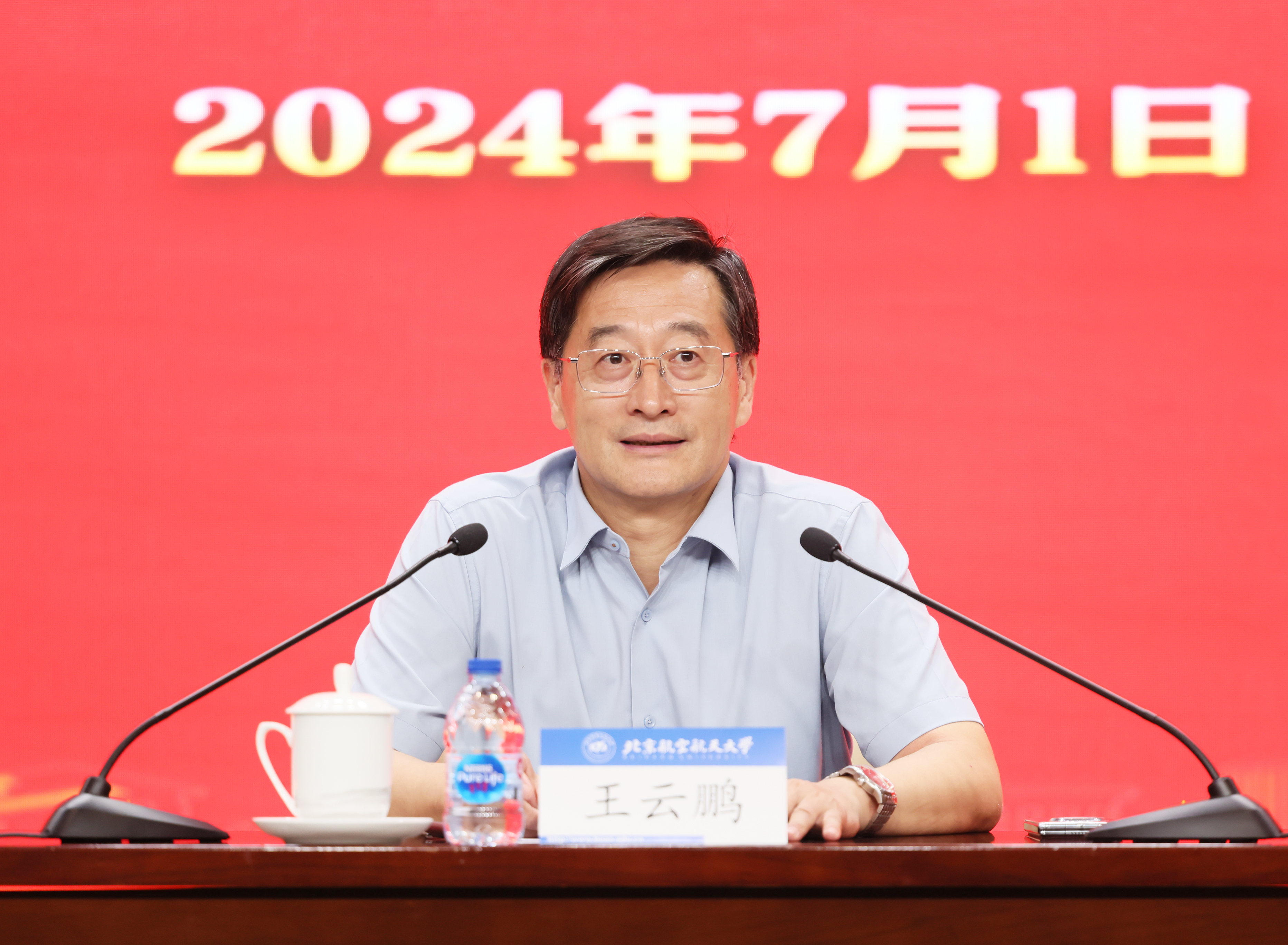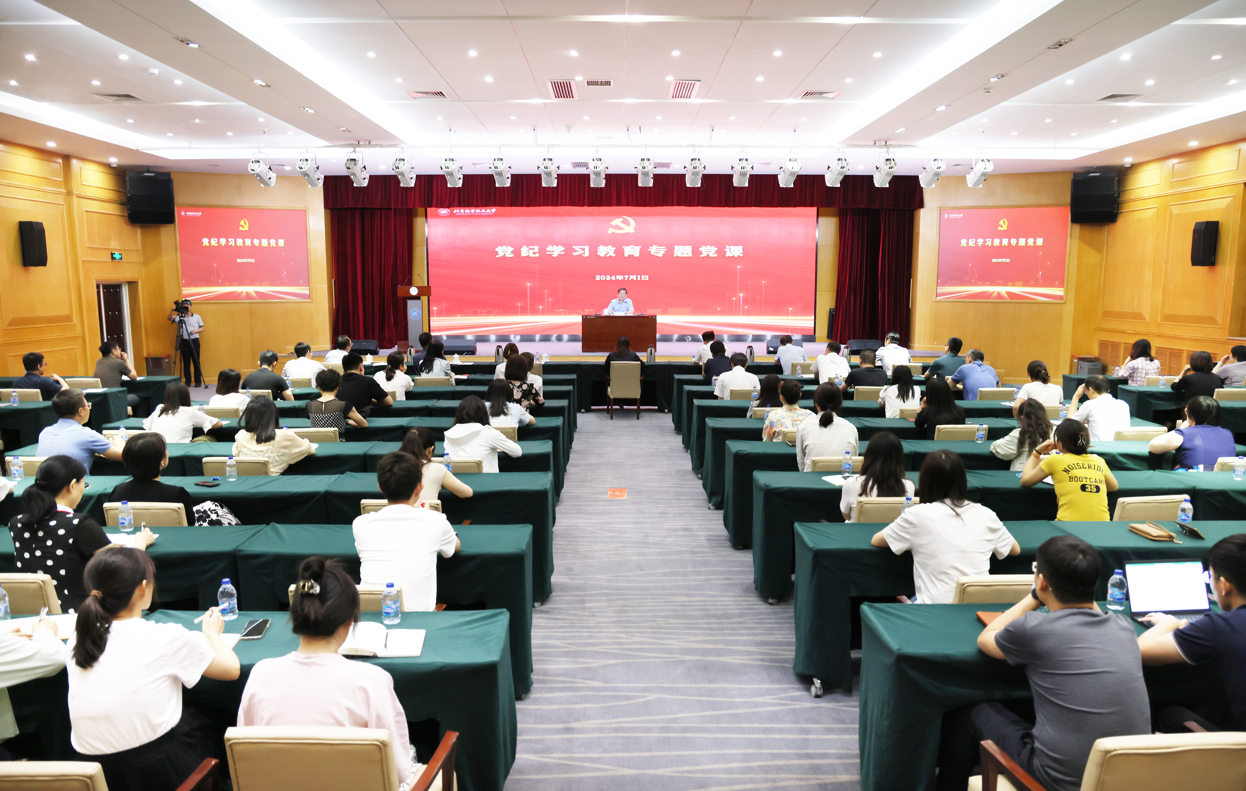北航新闻网7月2日电(记者 王晴/文 邸白鹭/摄影)7月1日上午,校长王云鹏在如心会议中心大报告厅讲授党纪学习教育专题党课,副校长邓怡主持会议。学生工作部、教务部、研究生院、校团委、学生中心党员干部聆听党课。